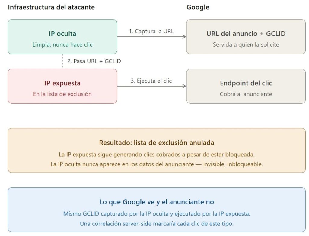Correlacionar esas dos IPs es una operación server-side. Google podría marcar como inválido cualquier clic cuyo GCLID fue capturado desde una IP distinta a la que lo ejecuta, o — como mínimo — tratar como inválidos los clics que provengan de IPs que están en la lista de exclusión del propio anunciante, independientemente de qué IP capturó la URL en primer lugar. Ninguna de las dos cosas es técnicamente compleja. Ninguna requiere una señal nueva que Google no esté recogiendo ya.